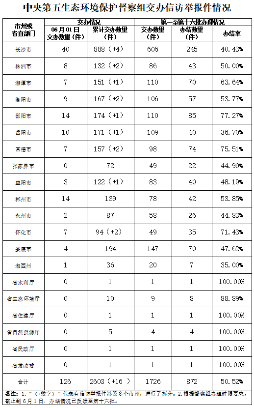 中央第五生态环境保护督察组今天向湖南交办群众信访举报件126件(来电举报74件,来信举报52件),其中重点件10件。