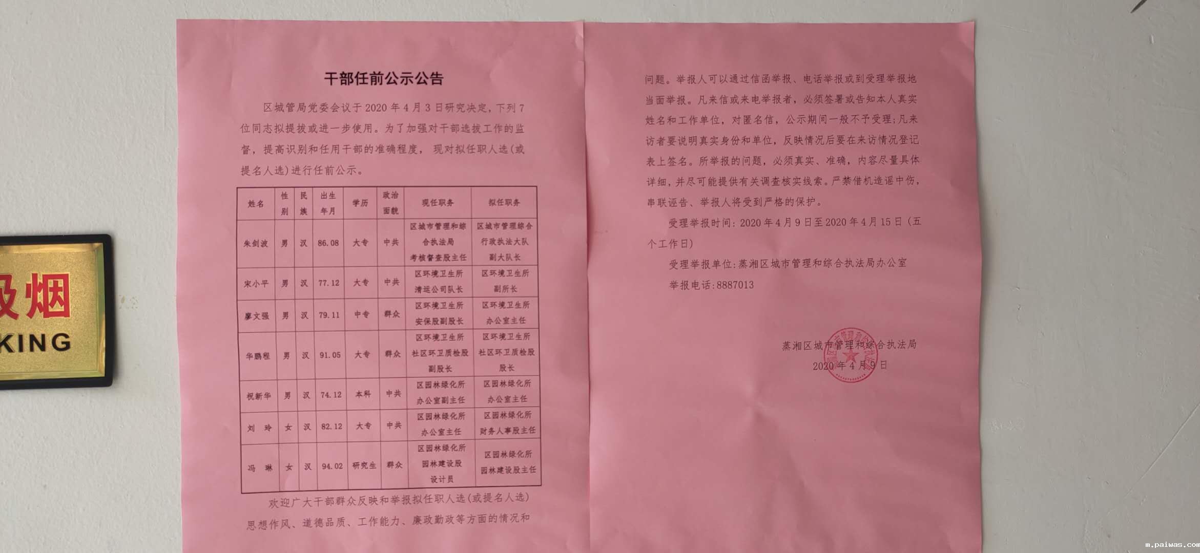 区城管局股级干部任前公示公告
