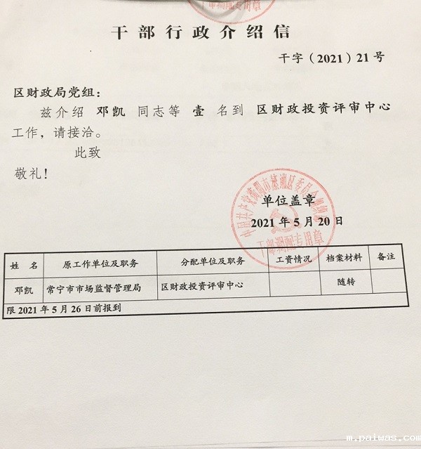 关于邓凯同志的调入